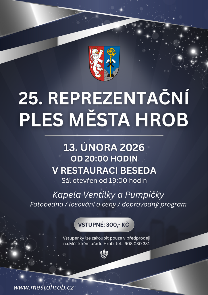 Přijďte si užít 25. reprezentační ples města Hrob s hudebním doprovodem kapely Ventilky a Pumpičky 13. února 2026 v restauraci BESEDA Hrob.